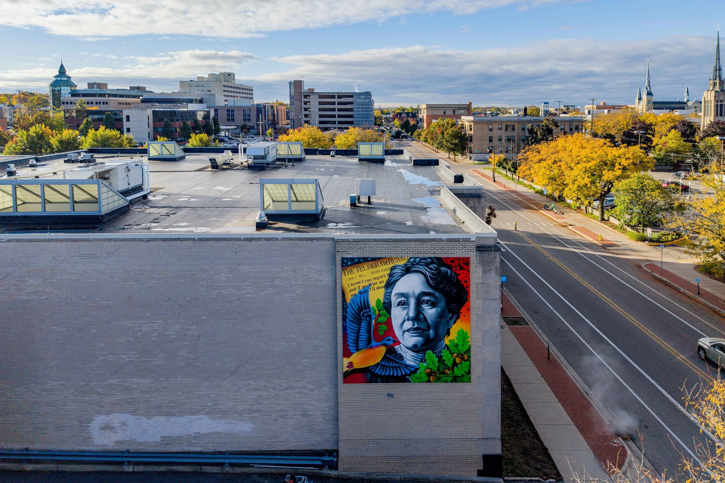 Harriet Woods-Hill was resilient and humble. Symbolism flows through this piece as waves pay ode to Harriet’s hometown leading to the old-time Grand Rapids cityscape. Lotus flowers symbolize her growth out of muddy waters, all the while soaring above.