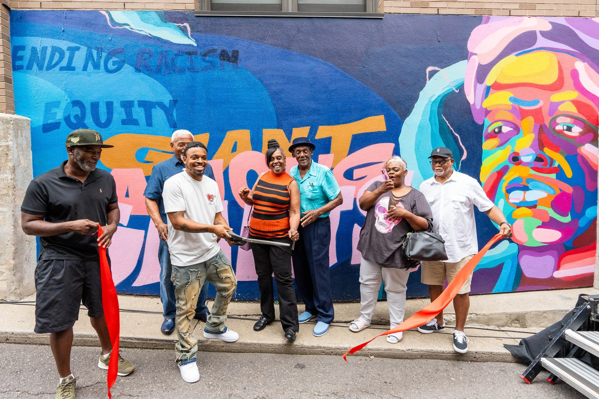 Dr. Sims was persistent, committed, persuasive, and driven by her faith. A giant among giants, as she was recognized in 2005, among many other awards, for her achievements. Dr. Sims was involved with many organizations in Grand Rapids over the course of several decades. So, how does one depict her work in a single mural? I wove a colorful cloud through the entire piece, beginning in the fields of Mississippi near a sharecropper’s cabin where she spent her early years, up to a vibrant portrait of Dr. Sims in her later years. I chose to focus on a few key concepts. After learning of her involvement with the Grand Rapids Study Club, and their motto of “rowing not drifting”, I chose to include a row boat, surrounded by several ripples, signifying Dr. Sims’ far reaching impact in the community. Several people noted that most did not see Dr. Sims’ impact, but they surely felt it, even without knowing it. I wanted to emphasize persistence. I also embedded some of Dr.Sims’ characteristics I pulled from interviews and obituaries from friends and family. Another consideration for this piece is the placement. I chose design elements that run horizontal ie; the clouds, fields, and ripples, to draw the viewer’s eyes all the way down the alley-like driveway. I chose to work with a semi limited color palette for the three panels leading up to the portrait of Dr. Sims. This allows for the colors found within Dr. Sims portrait to pop and further draw viewers’ eyes and interest towards the right side of the mural.”